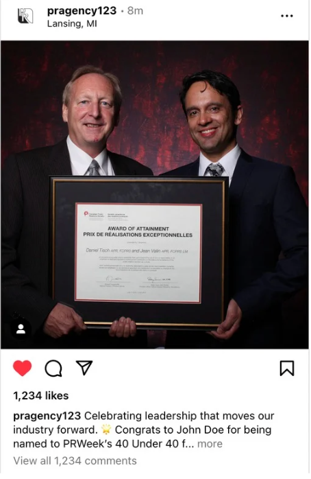 This is an Instagram post I created for a fake PR agency's Instagram. This post highlights one of the agency’s team members who is from an underrepresented group for their recent achievement.